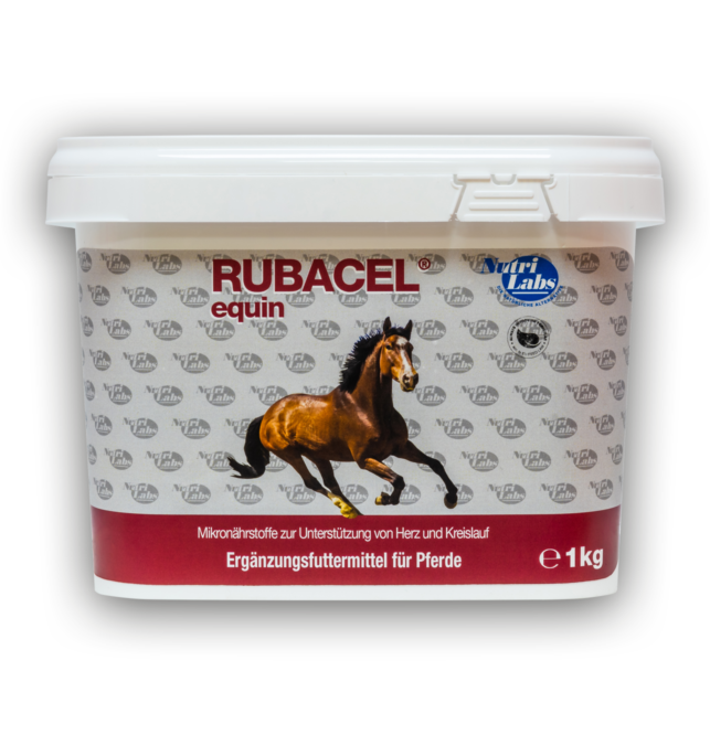 Rubacel® equin ist ein Ergänzungsfuttermittel für Pferde, das speziell auf den Stoffwechsel des Herzmuskels ausgerichtet ist und das Tier mit speziellen Mikronährstoffen zur Unterstützung eines kräftigen Herzschlages versorgt. So sind z.B. die Vorteile einer Versorgung mit Weißdorn, aber auch mit L-Carnitin für die Schlagkraft und die Energieversorgung des Herzmuskels wissenschaftlich gut belegt. Auch die Verbesserung der Blutfette durch Omegafettsäuren ist dabei ein wichtiger Vorteil. Rubacel® equin wird besonders empfohlen für Tiere, die starken Belastungen für Herz und Kreislauf ausgesetzt sind.