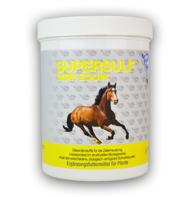 Supersulf® MSM equin ist eine Mischung aus 3 verschiedenen biologisch verfügbaren Schwefelquellen: Organischer Schwefel (Methylsulfonylmethan), anorganische Schwefelverbindungen sowie die schwefelhaltige Aminosäure Methionin. Die Verabreichung verschiedener Schwefelquellen ist biologisch wesentlich sinnvoller als die Fütterung nur einer einzigen Schwefelverbindung. Schwefel ist eines der wichtigsten Strukturelemente des Körpers von Pferden. Die Ergänzung der Nahrung mit den 3 Formen von biologisch verfügbarem Schwefel in Supersulf® MSM equin stärkt das Bindegewebe und unterstützt den Stoffwechsel besonders in Zeiten hoher Anforderungen an die Synthese- und Reparationsmechanismen.